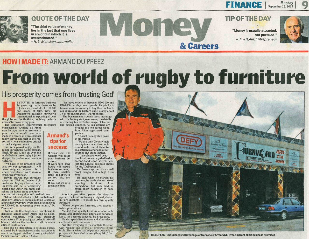 | Wie sal kon dink dat die robuuste voormalige junior-Springbokrugbyspeler, Armand du Preez, ’n aangebore sin vir elegansie kan hê. Selfs met ’n huis teen die Rocky Mountains, verkies hy en sy groot gesin Suid-Afrika bo ander lande. Furnworld International se wêreld van unieke - en eksotiese leermeubels is in 1999 deur mnr. Armand du Preez gestig nadat ’n kniebesering sy rugbyloopbaan kortgeknip het en omdat hy bevind het dat daar ’n behoefte aan eksotiese en voortreflike gehalte-leermeubels is. Ná omvattende navorsing in wat kliënte se behoeftes is en met ’n begeerte om ’n produk te verskaf waarvoor daar nêrens in die wêreld ’n gelyke is nie, het Du Preez vyf ononderhandelbare beginsels geïdentifiseer: Net die beste gehalte volgreinleer moet gebruik word. Niks sal van ondernemings verkry word wat betrokke is by wreedheid teen diere nie. Die rame word saamgestel van gegradeerde hout en net deur ware vakmanne. Die produk moet vir generasies oorleef. Kliëntediens moet jou kliënt se verwagtinge oortref. Furnworld International het by sy beginsels gehou en is vandag een van die grootste onafhanklike vervaardigers / groothandelaars in Suid-Afrika. Furnworld International het in 2006 sy deure in Denver, Colorado VSA en in 2016 Parma, Italië oopgemaak om die Amerikaanse en Europese markte te dien. Of jou voorliefde nou volstruis is of ’n kombinasie van ander leer, Furnworld International kan dit volgens jou spesifikasies maak. www.furnworldinternational.com |