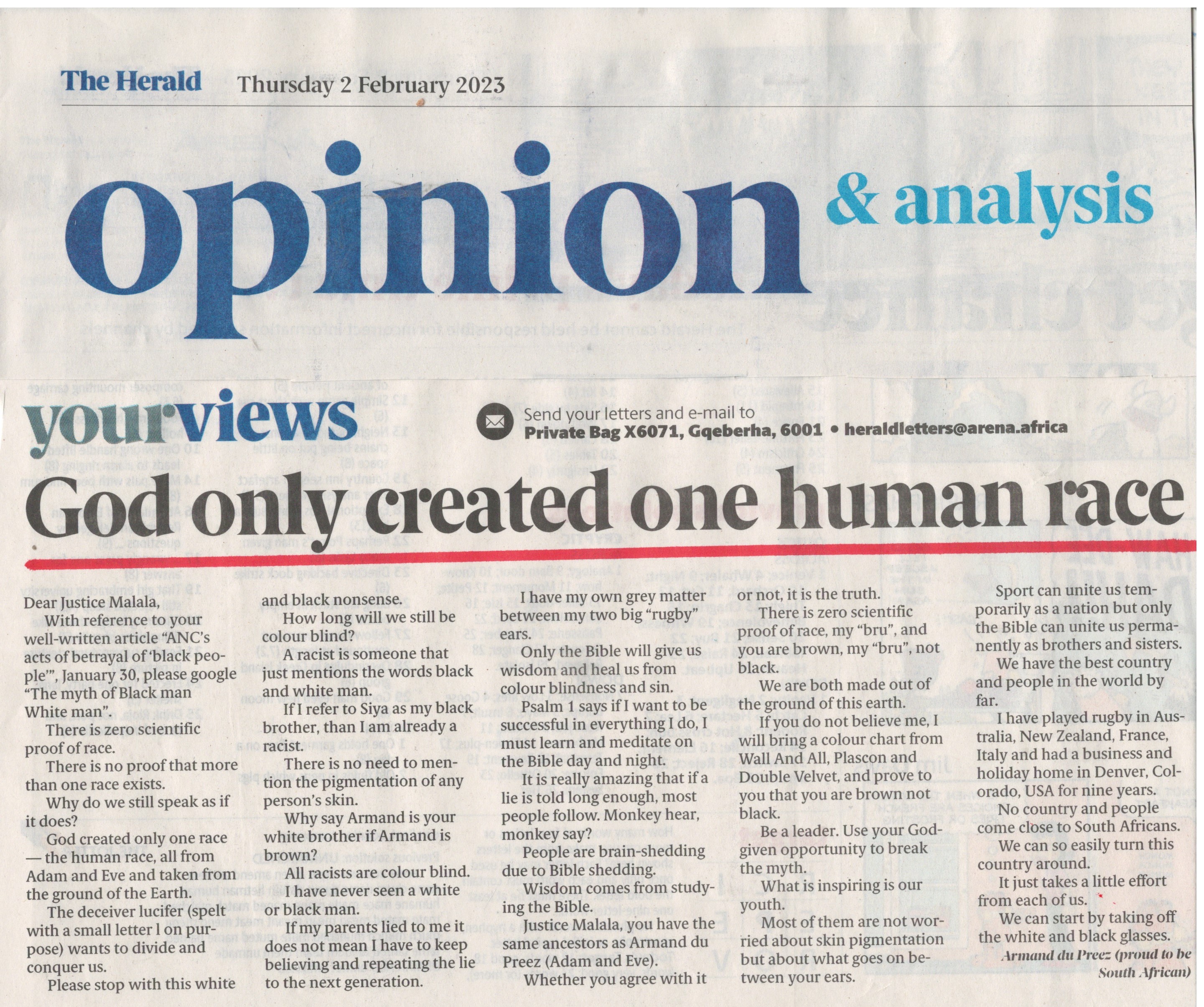 Ek het in baie lande rugby rugby gespeel en het tot die besef gekom dat daar geen beter land is as net hier waar Jesus my geplaas het nie. Dink jy aan weghardloop ? (jy gaan dit berou) en maak liewers n verskil daar waar jy woon-ONS DOEN EN ONS MAAK N GROOT VERSKIL . “Tired of Julius Mal lema ? Jesus is the answer!!