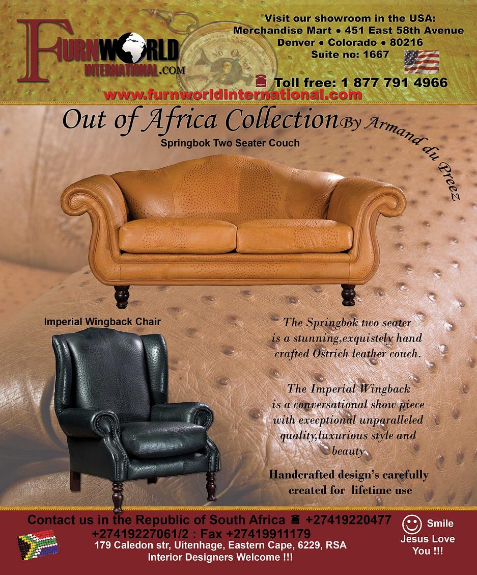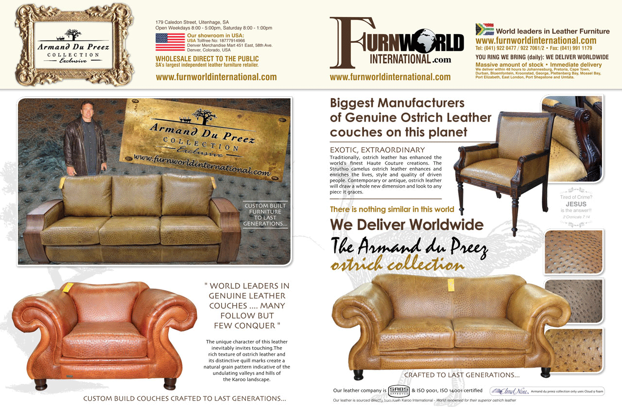 Armand du Preez Collection Genuine Ostrich leather couches as advertized in the following magazines